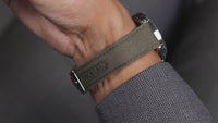 Encased in a round, polished silver-coloured case, this timepiece commands attention. Its black dial features vibrant green printed numbers, adding a striking contrast and a touch of modernity. Complementing the design is a khaki-coloured canvas strap so whether you're attending a formal event or exploring the great outdoors, this watch effortlessly combines elegance with durability, making it the perfect companion for any occasion.